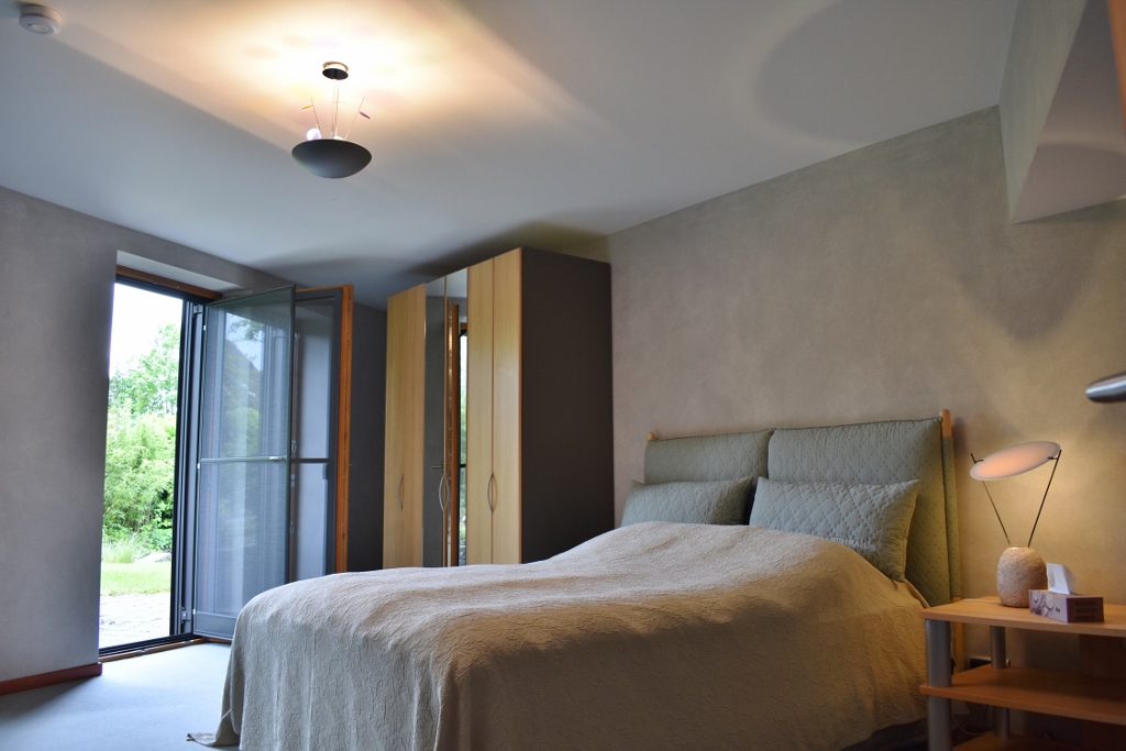 Das Untergeschoss des Hauses beherbergt zwei lichtdurchflutete Gästezimmer mit dazwischen liegendem, repräsentativem Tageslicht-Bad. Hier gelangen Sie über einen terrassenartigen Weg direkt zum Schwimmteich mit Außendusche und zur Fasssauna.