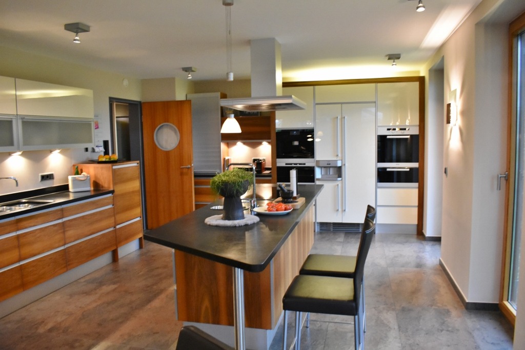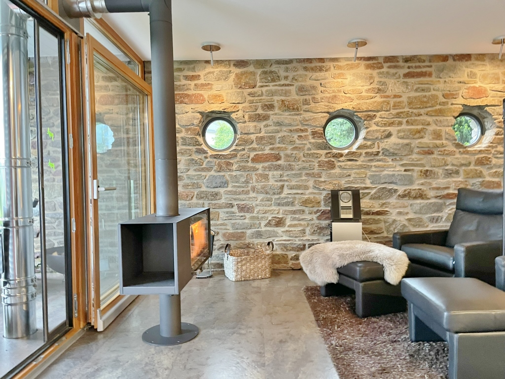 Mittelpunkt des Erdgeschosses ist die opulente Küche einschließlich großzügigem Essbereich und das sich daran anschließende repräsentative Wohn-/Kaminzimmer. Die Raumhöhe im Wohnzimmer und die fast im gesamten Haus bodentiefen Fenster, einschließlich elektrischer Alu-Außenjalousien, vermitteln nicht nur Modernität und Offenheit, sondern geben auch überall den Blick frei ins Grüne. Den unverwechselbaren Charakter des Kaminzimmers bestimmen nicht nur der zum Wohnzimmer hin drehbare Kamin, sondern die auch hier prägende, massive Natursteinwand mit ihren integrierten Bullaugen und die davor liegende Kaminterrasse, von der Sie einen der schönsten Blicke auf den Naturschwimmteich haben.