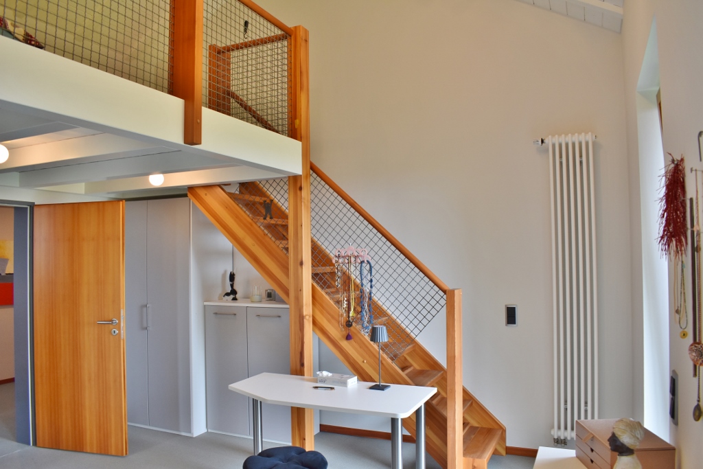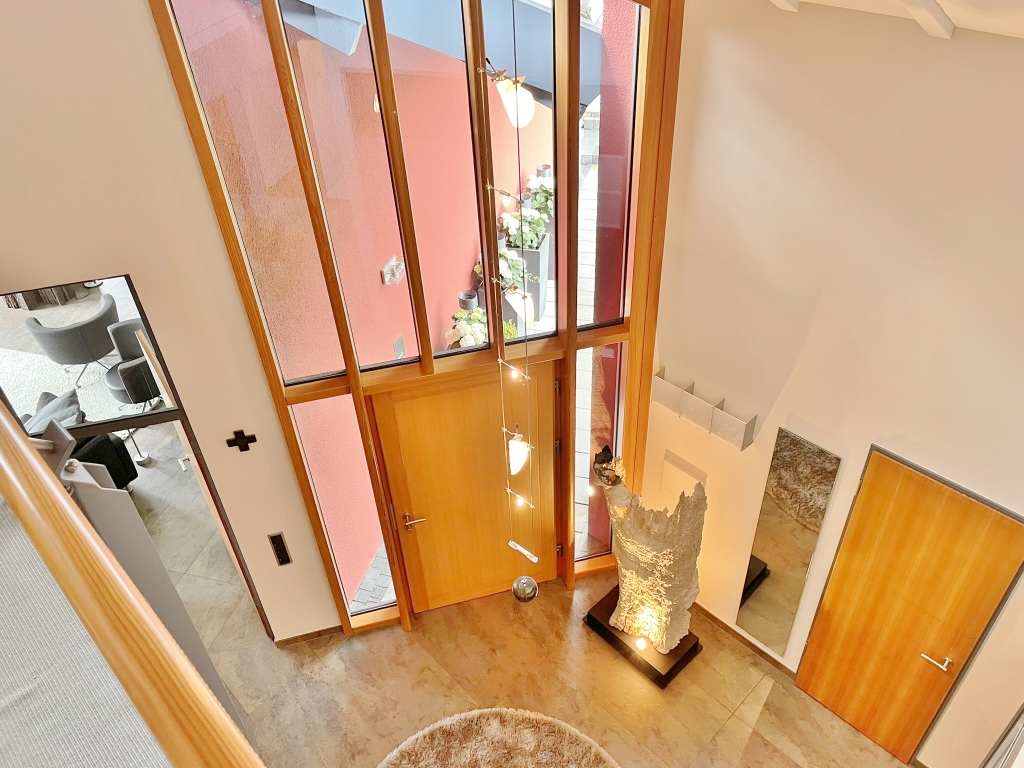 Schon von außen signalisiert dieses Haus durch die fulminante, in massiver Bauweise errichtete Natursteinwand aus belgischem Bruchstein seinen unvergleichlichen Charakter. Beim Betreten setzt sich diese Imposanz im Entree fort. Offen bis unter das Dach schweift der Blick direkt auf die innen-architektonisch anspruchsvolle Treppengestaltung, endend auf der freischwebenden Galerie. Es lässt sich hier schon die Großzügigkeit des gesamten Hauses und das gehobene Ambiente erahnen.