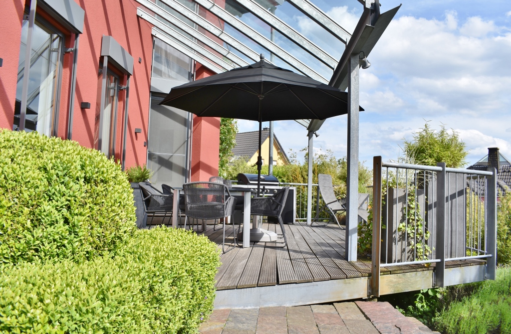 Der Außenbereich des Hauses wird neben ausreichend Stellflächen, der architektonischen Gestaltung des Vorgartens einschließlich Springbrunnens, vor allem bestimmt durch den einzigartigen, nahezu uneinsehbaren Garten mit Naturschwimmteich, Außendusche, einem wunderschönen, teilweise verglastem Gartenhaus mit zu öffnendem Dach, wiederum aus dem gleichen belgischen Naturstein und mit freiem Blick auf den Schwimmteich, einem Whirlpool und einer heimeligen Fasssauna.