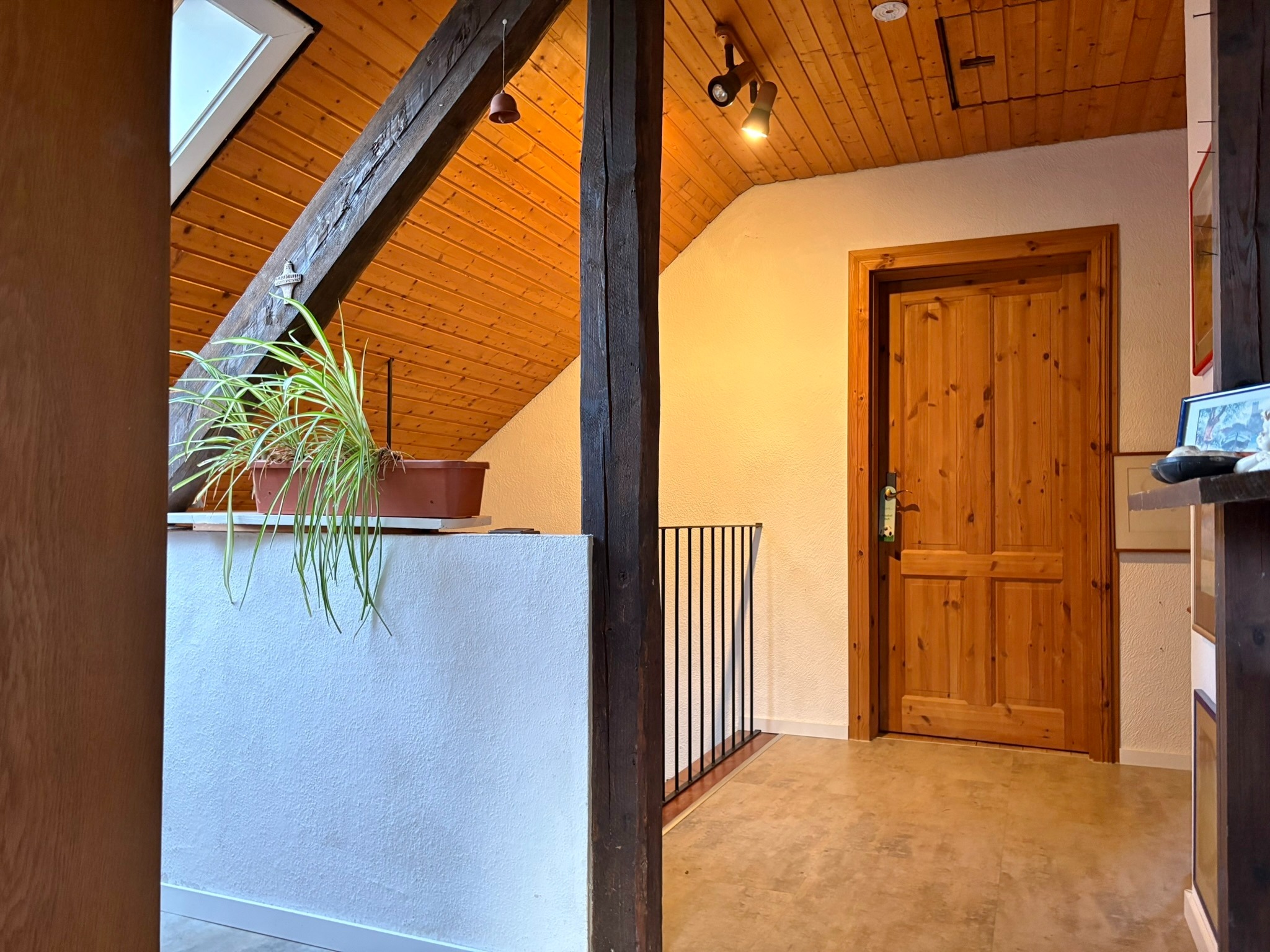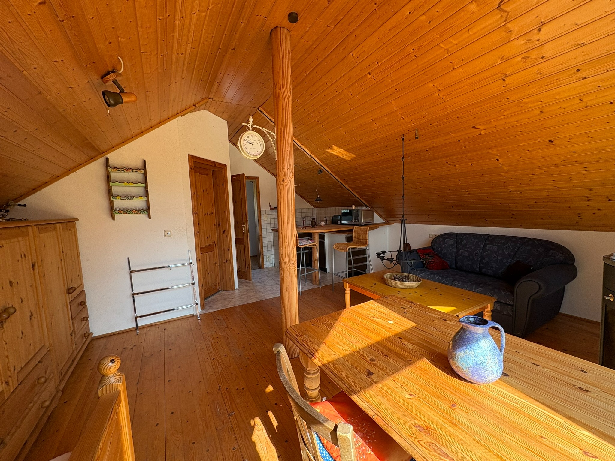 Über eine offene Holztreppe gelangen Sie ins Dachgeschoss, das mit einem großzügigen Wohn-, Schlafzimmer, einer Küche, Zimmer sowie einem weiteren Duschbad begeistert. Dieser Bereich kann familiär bei Bedarf als separate Einheit gestaltet werden – ideal für größere Familien oder Gäste.