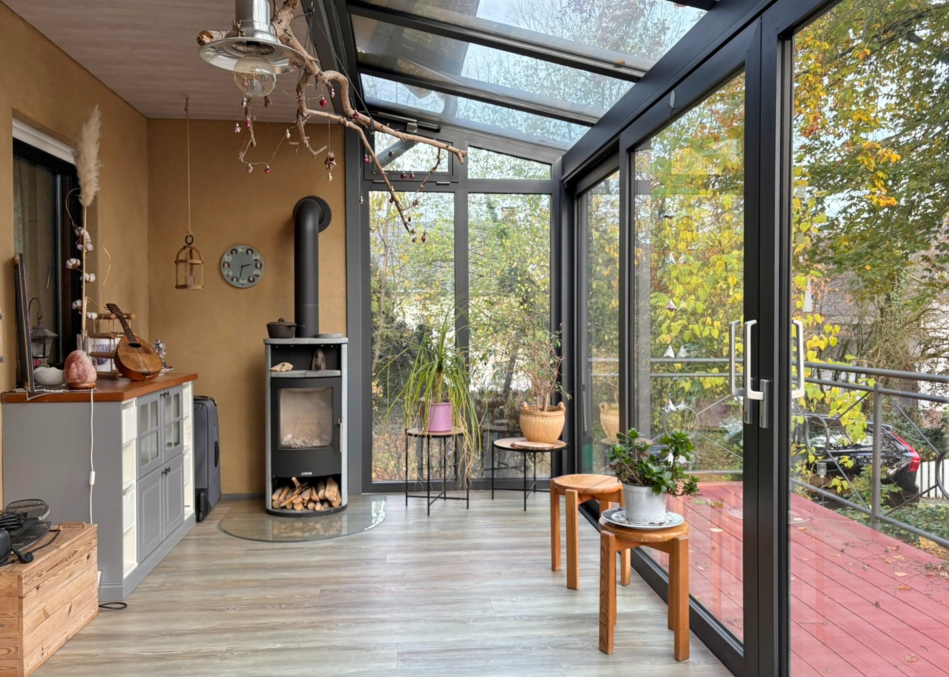 Über den einladenden Hauseingang mit überdachtem Eingang gelangen Sie in die Diele – und spüren sofort den wohnlichen Charakter dieses Hauses. Im Erdgeschoss erwartet Sie der großzügige offene Wohn- und Essbereich, der mit seinem gemütlichen Kaminofen und dem 2021 errichteten Wintergarten zum Verweilen einlädt. Hier genießen Sie zu jeder Jahreszeit ein behagliches Wohngefühl – im Winter am prasselnden Feuer, im Sommer mit Blick ins Grüne. Der Wintergarten wurde schnell zum Lieblingsraum – lichtdurchflutet, warm und wohnlich. Er schenkt einen herrlichen Ausblick in den Garten und auf den sonnigen Balkon – ein Ort, an dem Ruhe und Natur verschmelzen. In den letzten fünf Jahren wurden außerdem Duschbad, Flur und Innentüren im Erdgeschoss sowie das Bad mit bodentiefer Dusche modernisiert. Die Küche ist mit einer Schiebetür vom Essbereich getrennt, was eine angenehme Raumaufteilung schafft. Ein Schlafzimmer sowie ein praktischer Abstellraum runden das Erdgeschoss ab.