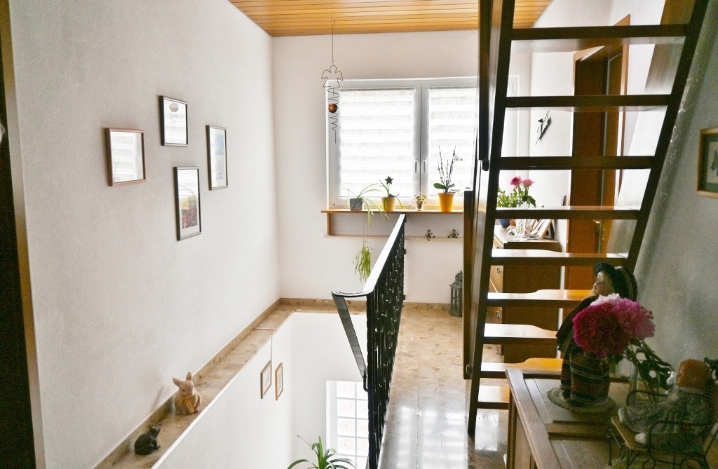 Das ursprünglich um 1950 erbaute Haus wurde einst als familiengeführte Möbelschreinerei mit großzügiger Raumhöhe konzipiert. Heute bietet es über 130 m² Wohnfläche auf mehreren Ebenen – liebevoll zunächst in 1980 umgebaut, mit viel Platz für Ihre Träume. Die Eingangsdiele mit Garderobe und Gäste-WC im Erdgeschoss führt Sie über das Treppenhaus in den Wohnbereich. Der offene Wohn- und Essbereich im Obergeschoss mit Zugang zum Balkon lädt zu entspannten Abenden in der Abendsonne ein. Die angrenzende Küche, drei Schlafzimmer sowie ein Tageslichtbad mit Wanne und Dusche schaffen Raum für Familie und Geborgenheit. Eine ausklappbare Markise sorgt für Schatten an sonnigen Tagen, während Sie auf dem nach Westen ausgerichteten Balkon die Ruhe genießen.