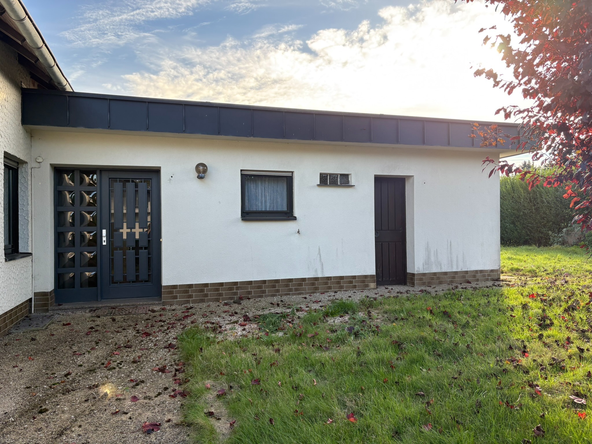 Anbau ehemalige Bürofläche mit Flachdach im Erdgeschoss und separatem Eingang: Diele, WC, Küche, großes Wohnzimmer/Büro, Abstellraum von außen begehbar